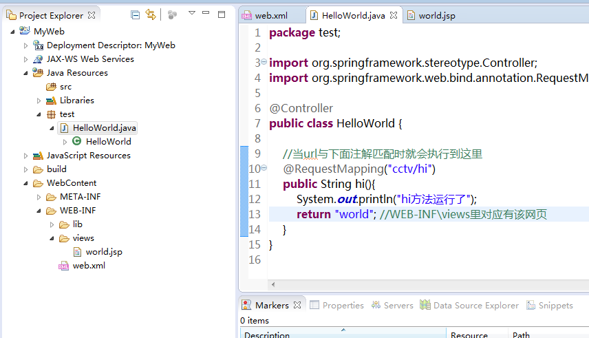 src 下新建test包HelloWorld 类(用作Controller控制器)新建方法hi,
