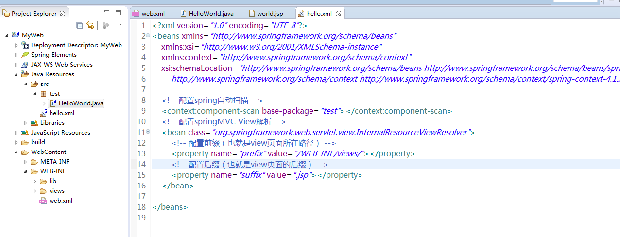 配置spring bean (hello.xml文件) 如图所示