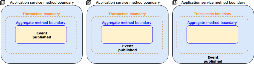 在另外两种情况下,则可以控制事件何时发布以及何时处理,在事务之内或事务外。