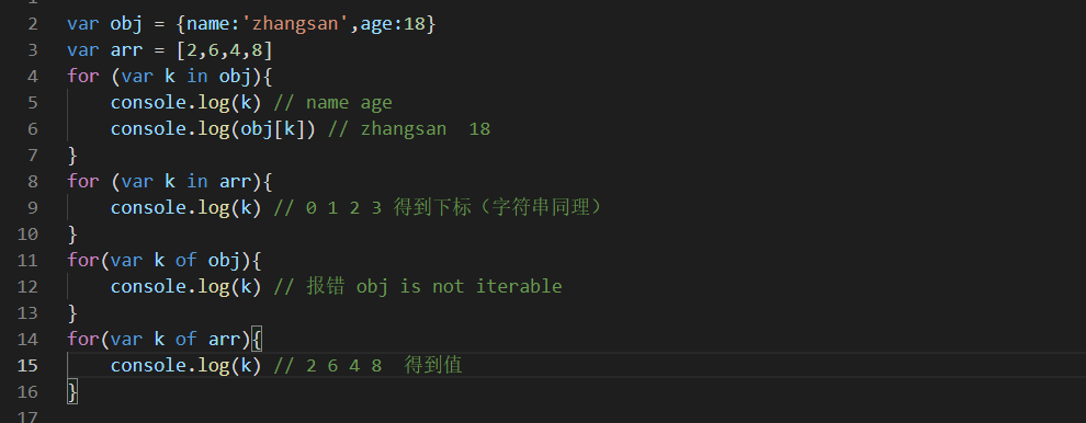 3,如果迭代的对象的变量值是null或者undefined, for in不执行循环体,建议在使用for in循环之前,先检查该对象的值是不是null或者undefined