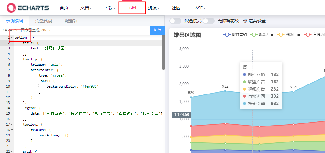 关键部分就是 代码中的 option ,这个可以从官网中的示例找需要的图形代码复制过来,就可以啦