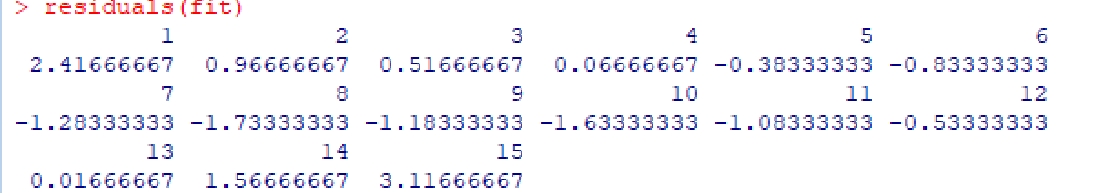 residuals(fit)列出拟合模型的残差值 残差=原数据-预测值