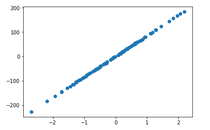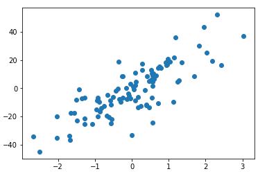 #把noise变大点,会更加离散,例如noise=10 X,y = datasets.make_regression(n_samples=100,n_features=1,n_targets=1,noise=10) plt.scatter(X,y) plt.show()
