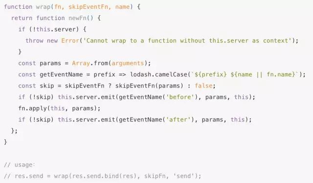 以上的描述基本上和语言,框架无关。回到 node 和 restify 本身,我们会发现,有些事情并不好处理。比如说,在 restify 里,一个路由的 action 往往就会直接调用 res.send() 发送数据,那么,post-processing 的各种行为如何能够注入?如果是从头开始构建一个框架,那么,pipeline 里的每个组件返回一个 Promise 或者 Observable,将其串联起来就可以了,但在 restify 里,你无法这么干。对于这样一个具体的问题,我采用的方法是使用 python 中 wraps 类似的方式:
