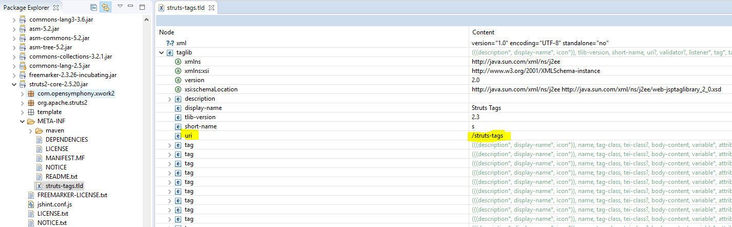 在struts2-core-2.5.20.jar下的META-INF下找到struts-tags.tld文件可以知道为什么这样指定uri:
