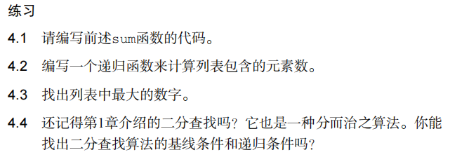(1)步骤:①找到简单的基线条件(可能是空数组货只包含一个元素的数组);②不断分解问题/缩小规模,直至符合基线条件。