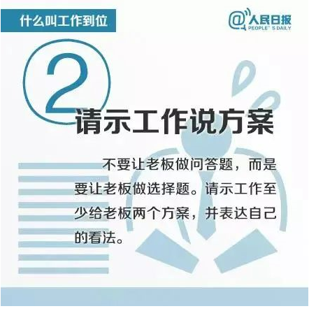 所以请示工作的时候一定要带着至少两个方案去找老板,这样既简化了老板的思考,也能体现出你自己的办事方法和办事能力,一举两得。