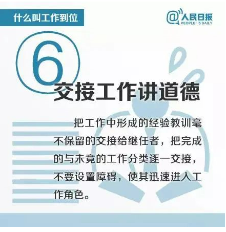 把工作中形成的经验教训毫不保留的交接给继任者,把完成的与未竟的工作分类逐一交接,更不要设置人为障碍,使接任者迅速进入工作角色。