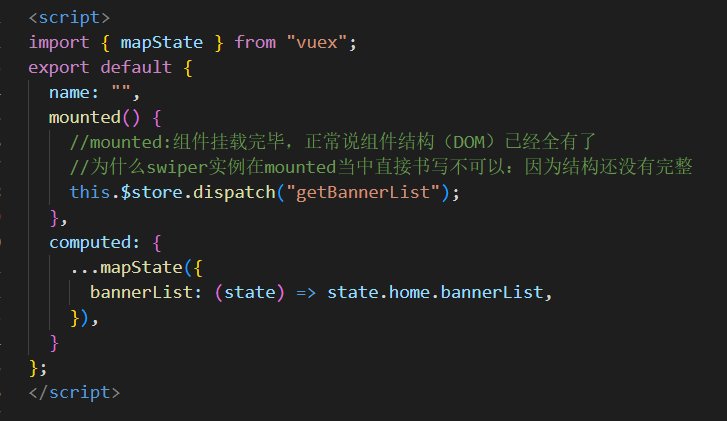 引入发送请求的api以及在原始仓库的state中配置bannerList(为空数组---根据相应的结果来:相应的result.data为数组,则为空数组,为对象,则为空对象)