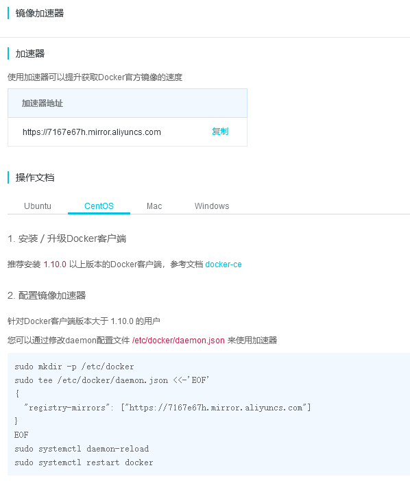 sudo tee /etc/docker/daemon.json <<-'EOF' { "registry-mirrors": ["https://7167e67h.mirror.aliyuncs.com"] } EOF