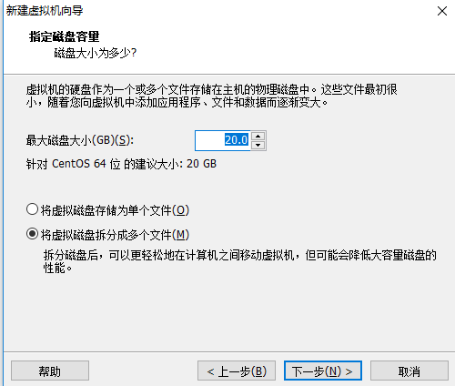 5.为虚拟机设置硬盘,选择虚拟机硬盘的存储方式(单个文件则所有虚拟机的全部封在一个文件中,这样移动起来不是很方便,但是性能较高,多个文件则相反),然后点击下一步