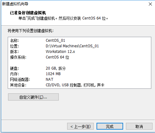 6. 点击自定义硬件可以适当的调整内存、CPU、网络等配置再点击完成,这样一个全新的虚拟机就创建好了。
