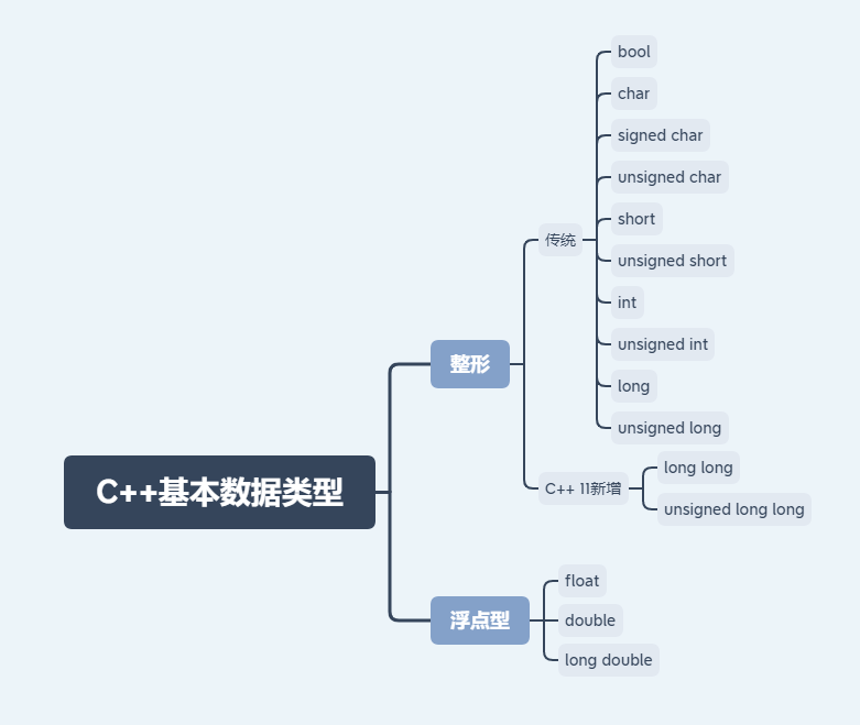 C++的基本数据类型可以分为整型和浮点型两种,如下图整型按照存储数据的大小从小到大依次为:bool、char、signed char、unsigned char、shot、unsigned short、int、unsigned int、long、unsigned long以及C++11新增的long long和unsigned long long,浮点型数据按有效位从小到大依次为:float、double和long double。