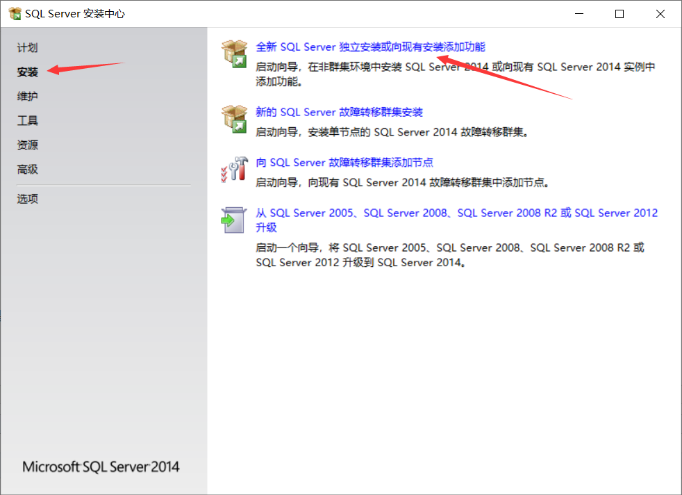 得到如下界面后,选择左侧的安装然后选择全新SQL Server独立安装得到如下界面。