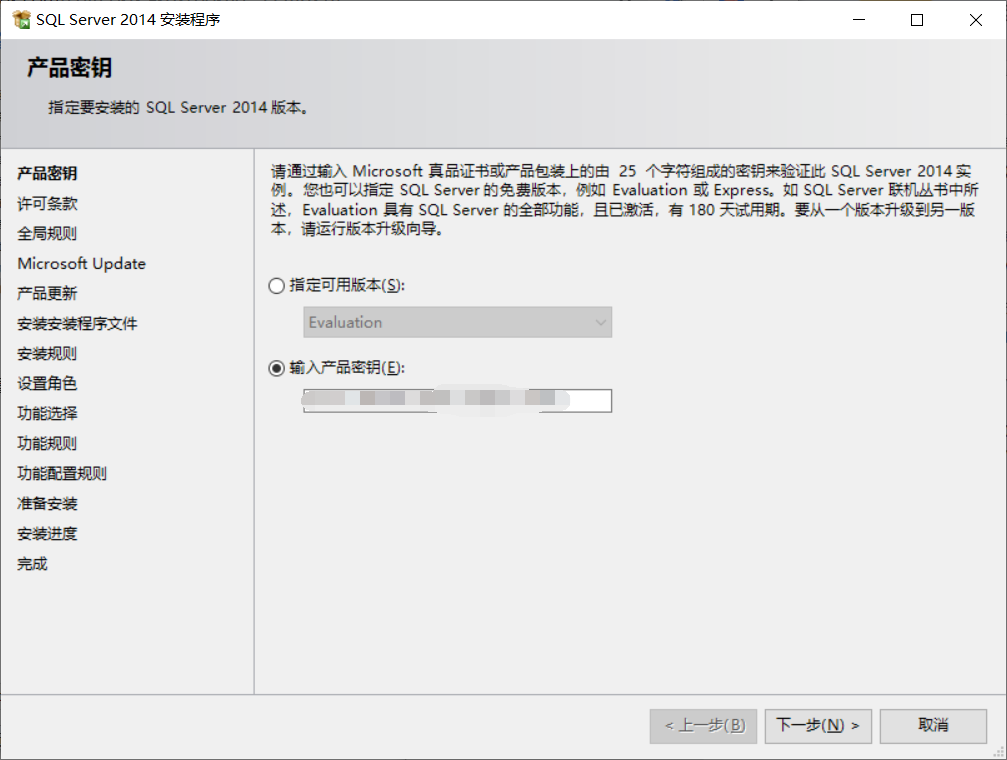 产品密钥是自动填写的,如果没有出现,自己填写就行,也可以使用Evaluation版本,不过只能用180天。下一步