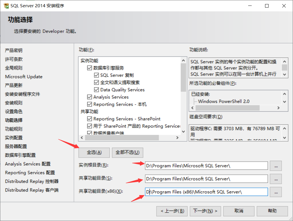 这一步按照自己的需要安装,实例必须安装,分析和报表可以不装,共享功能尽量装。我在这直接全选。其次就是下面的三个安装目录,我这里选择不安装到C盘,直接修改到D盘。然后下一步