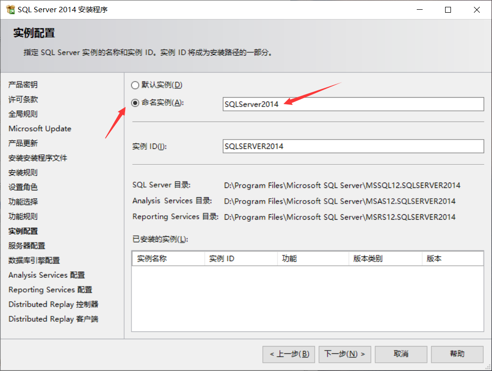 选择命名实例,也可以不选,在选择命名实例后可以自己起名字,这个名字就是你之后访问的数据库服务器名,在改变第一个名字后第二个输入框内容会自动同步。下一步
