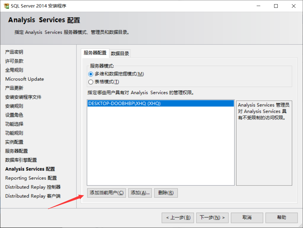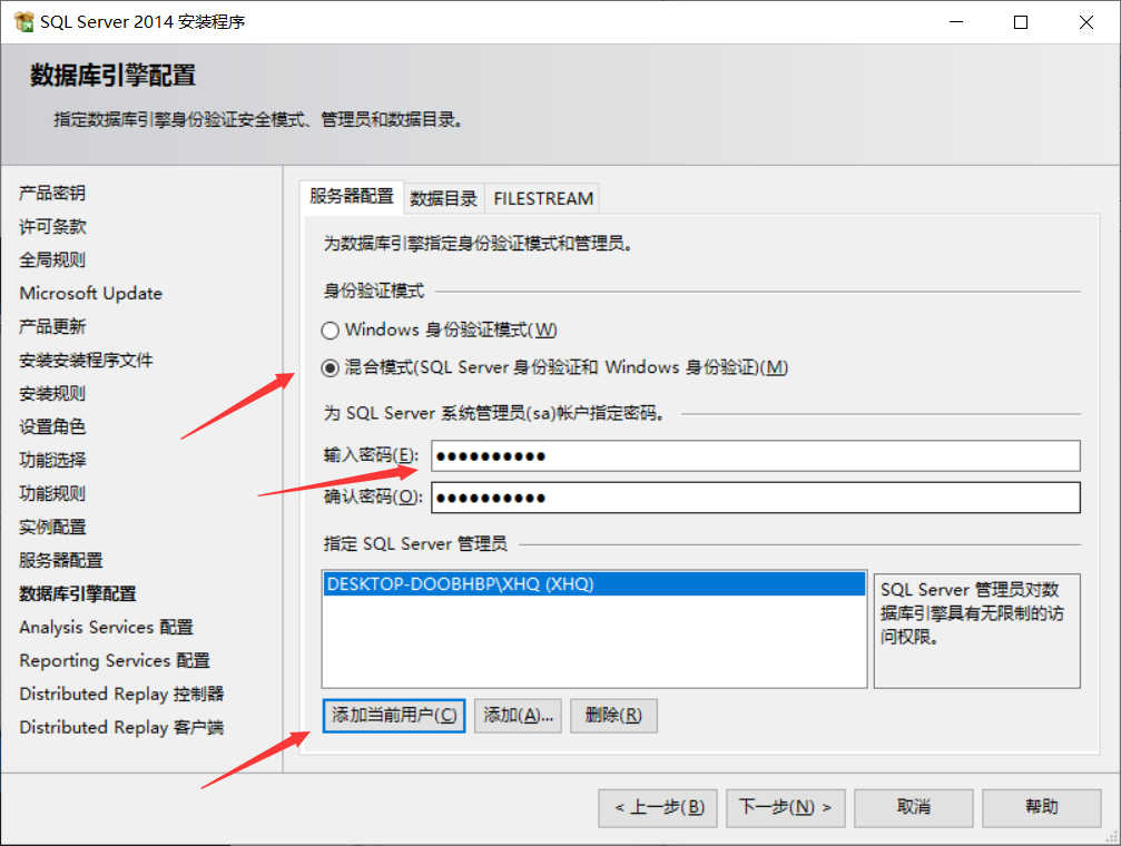选择混合模式然后添加密码就行,然后点击添加当前用户指定为管理员,下一步
