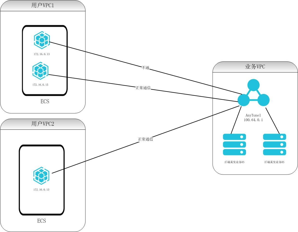 PS:AnyTunnel地址指的是每个VPC中100.64.0.0/10内的地址,用于VPC中DNS、YUM、NTP、OSS或SLS等云服务中使用。简单可以理解为在VPC下为了解决不同VPC内网互通的特殊的SLB。这个SLB能被同个Region下所有的VPC访问。