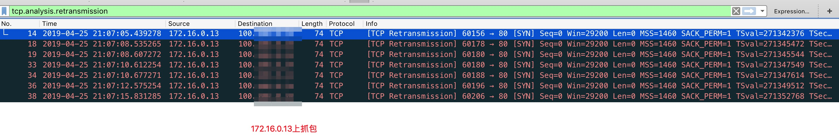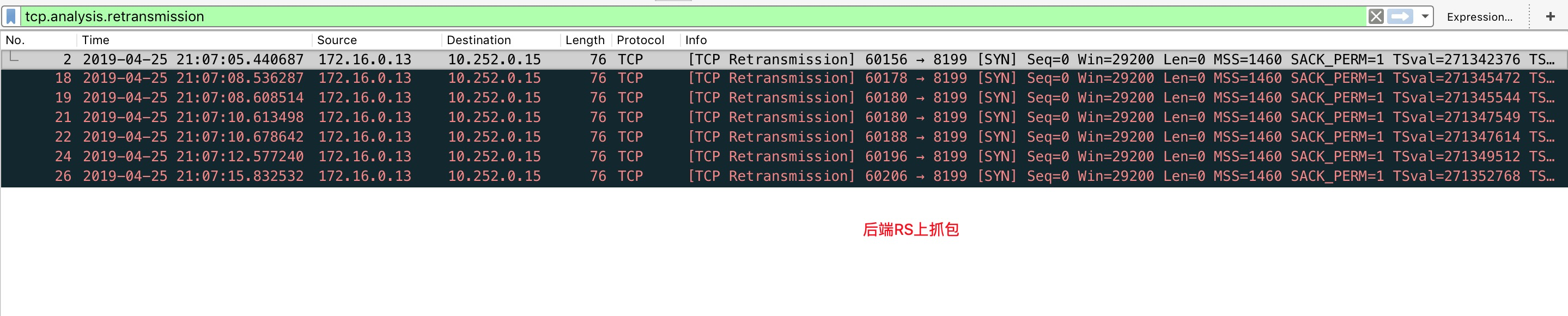 客户端和RS上抓包通过“tcp.analysis.retransmission”条件过滤出有问题的重传报文,发都是SYN的重传。
