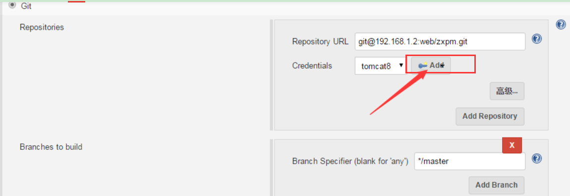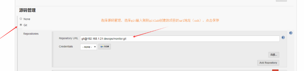 选择源码管理,选Git,输入仓库URL地址(如果下方出现红色及表示出错了),填好仓库地址,认证点击Add,然后选择保存
