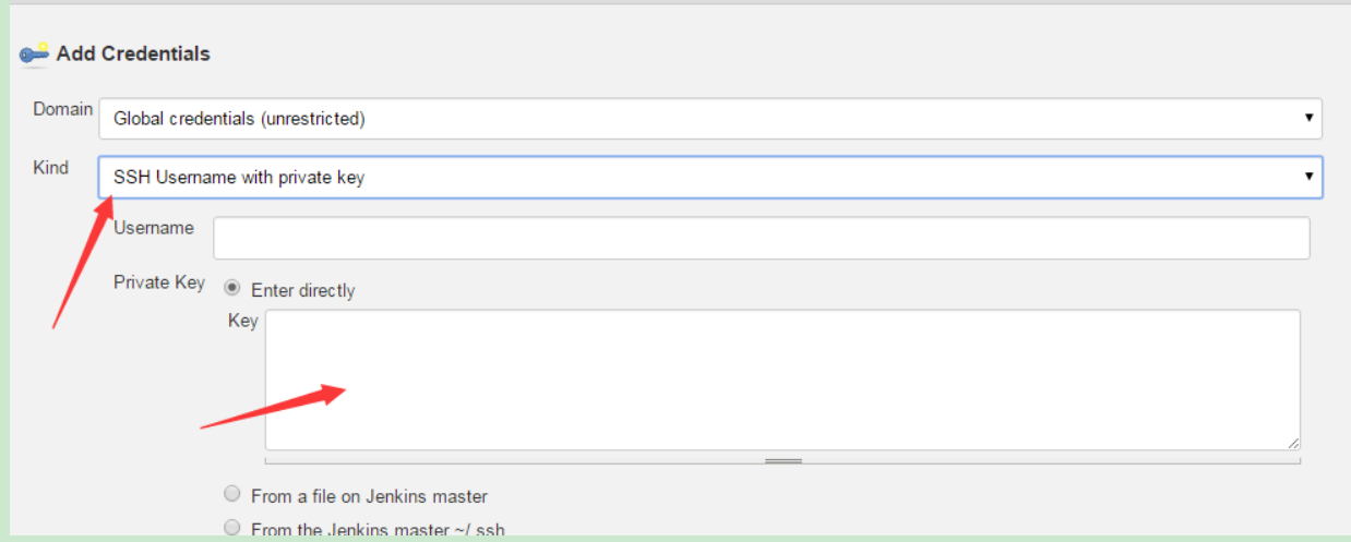 在Kind中选择SSH Username with private key,下面的Private Key选择Enter directly直接输入在Gitlab部署了public key对应的private key即可。一般public key是在~/.ssh/id_rsa.pub,而private key是~/.ssh/id_rsa。