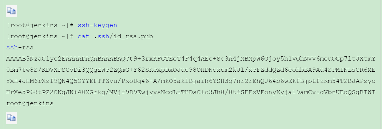 [root@jenkins ~]# ssh-keygen [root@jenkins ~]# cat .ssh/id_rsa.pub