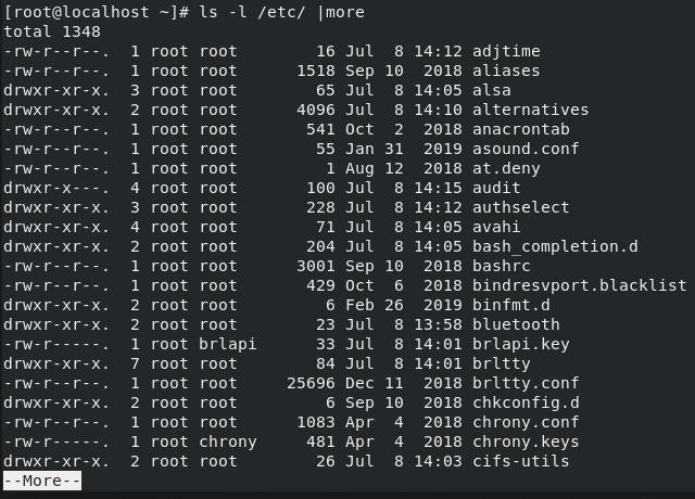 用翻页的形式查看/etc目录中的文件列表及属性信息: