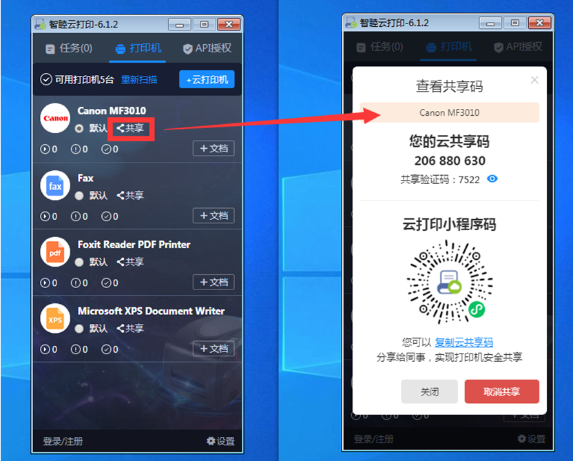 1、Windows电脑客户端启动后,客户端会自动扫描当前电脑安装的“本地打印机”及已添加的其他电脑共享的云打印机;共享打印机时只需选择具体的打印机,点击“共享”,复制云共享码发送给同事。
