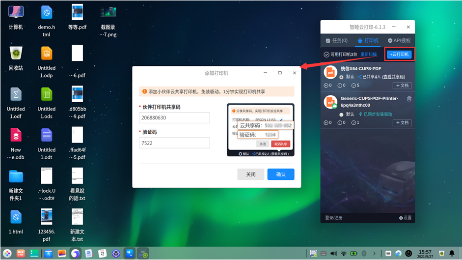 2、打开“智睦云打印”点击控制台【+云打印机】,在弹窗中输入Windows系统共享的打印机“云共享码”和“共享验证码”(本例中分别为“共享码:206 880 630”和“验证码:7522”),点击确认,统信UOS系统即已成功添加Windows共享的打印机。