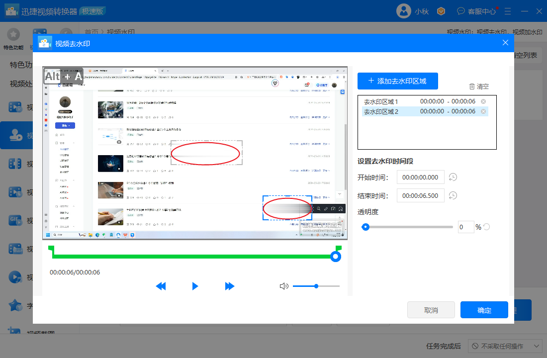 它的视频水印功能可以为视频去水印/视频加水印。上传视频文件,然后在编辑页面,框选视频中任意位置区域,将其覆盖即可快速去水印,几乎看不出修改痕迹。