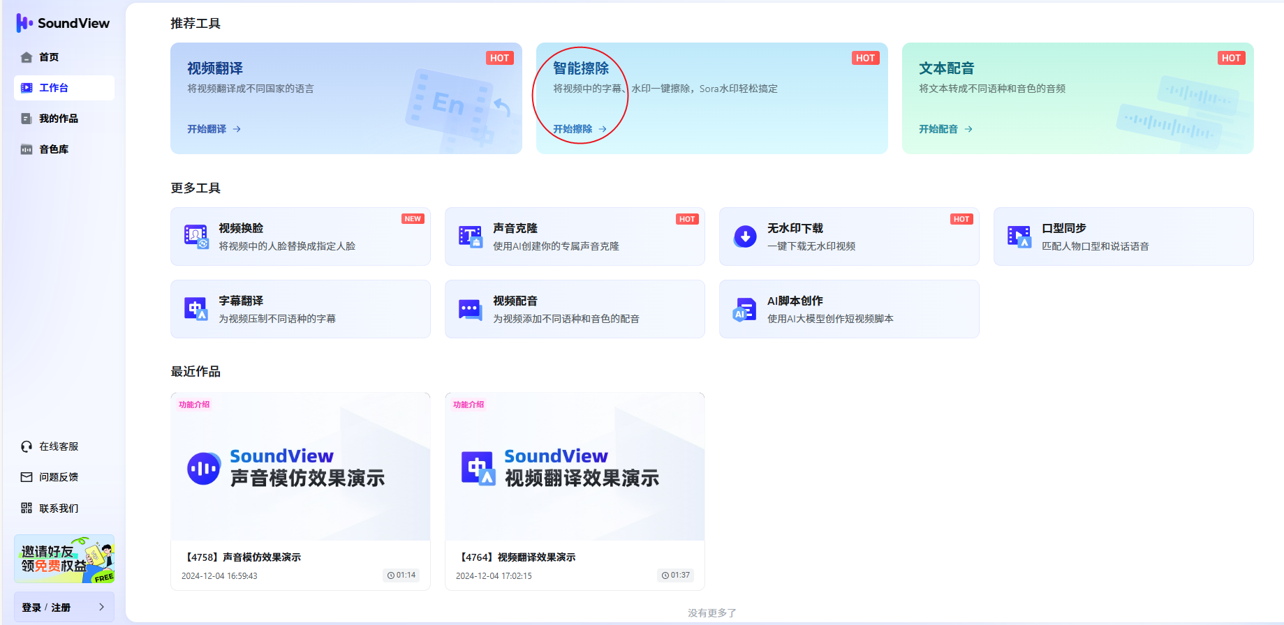 SoundView的自动识别消除功能很厉害。只需上传本地视频,它便能智能定位水印区域,并将其“融化”在背景画面中,相对来说更适合处理画面相对简洁、水印位置独立的视频,去除效果更干净。