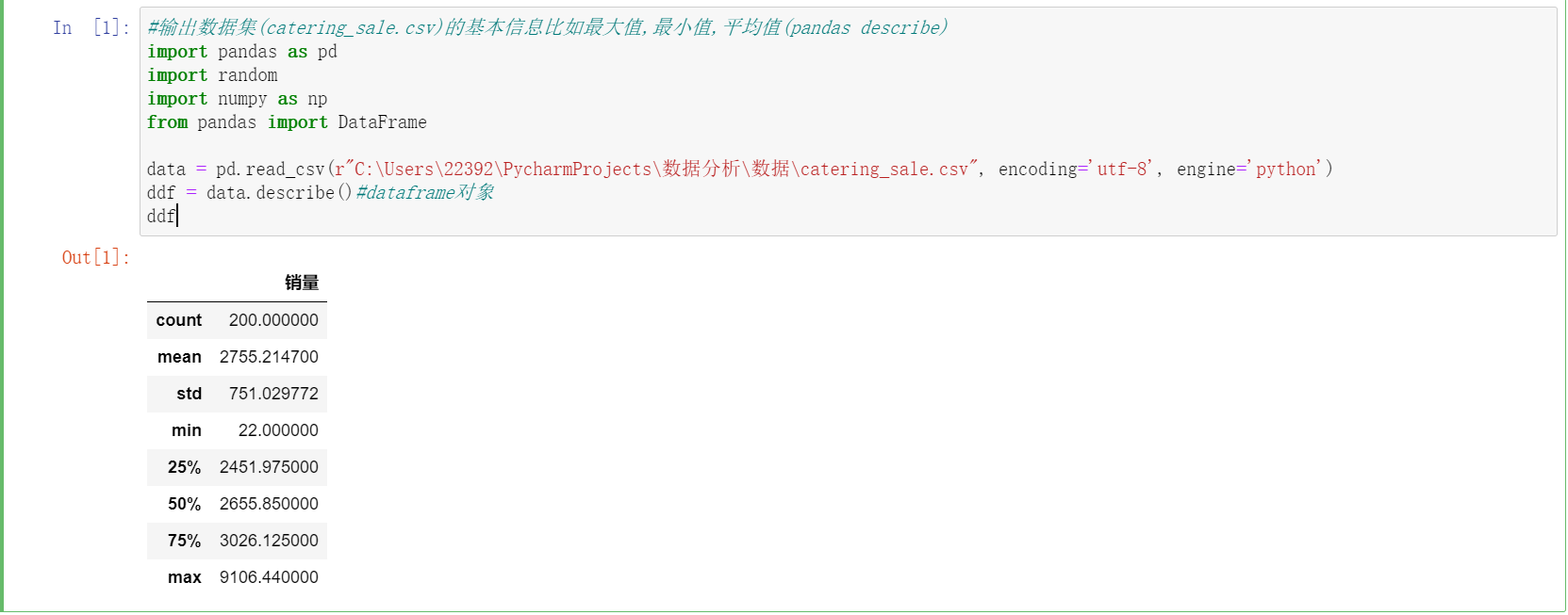 import pandas as pd import matplotlib.pyplot as plt import numpy as np df = pd.read_csv(r"C:\Users\22392\PycharmProjects\数据分析\数据\catering_sale.csv", encoding='utf-8', engine='python') plt.rcParams['font.sans-serif'] = ['KaiTi'] plt.rcParams['axes.unicode_minus'] = False fig,axes = plt.subplots() df.boxplot(column='销量',ax=axes) axes.set_ylable('values of tip_pct') fig.savefig(r'c:\p3.png')
