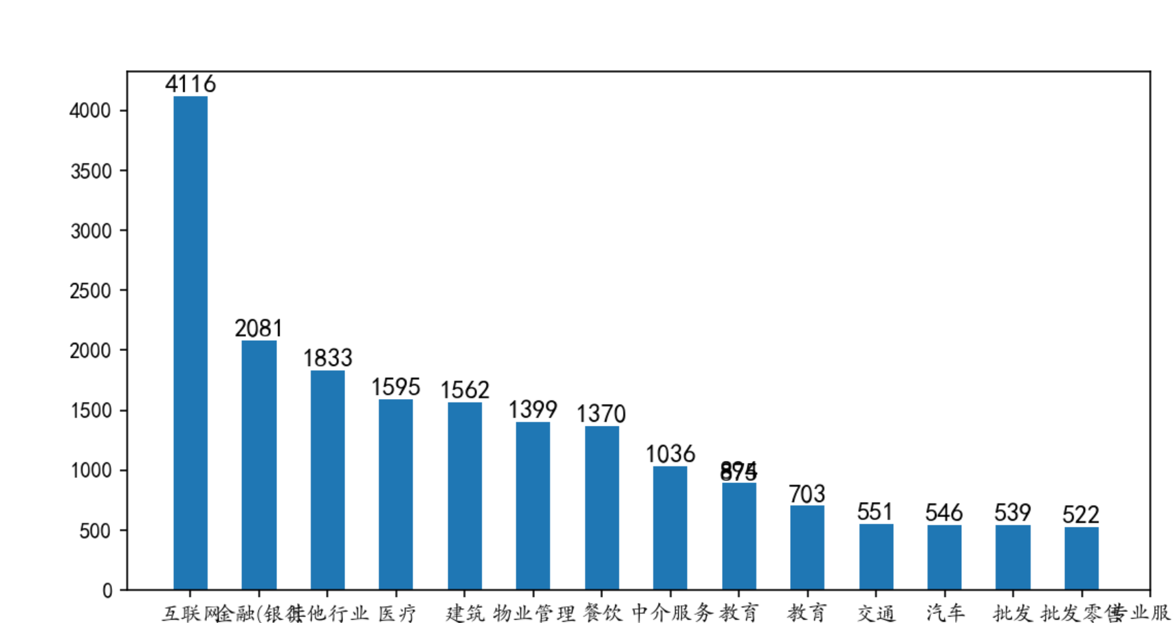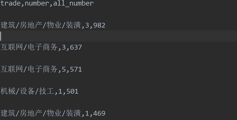 C:\Users\22392\PycharmProjects\数据分析\venv\Scripts\python.exe C:/Users/22392/PycharmProjects/数据分析/职位2.py trade 互联网/电子商务 4116 金融(银行/保险) 2081 其他行业 1833 医疗/美容/保健/卫生 1595 建筑/房地产/物业/装潢 1562 物业管理/商业中心 1399 餐饮/娱乐/休闲 1370 中介服务/家政服务 1036 教育/培训 894 教育/培训/学术/科研 875 交通/运输/物流 703 汽车/摩托车/零配件 551 批发/零售 546 批发零售 539 专业服务/财会/法律 522 电子/半导体/集成电路 516 机械/设备/技工 503 金融(投资/证券 449 服装/纺织/皮革 447 消费品(食/饮/烟酒) 438 dtype: int64