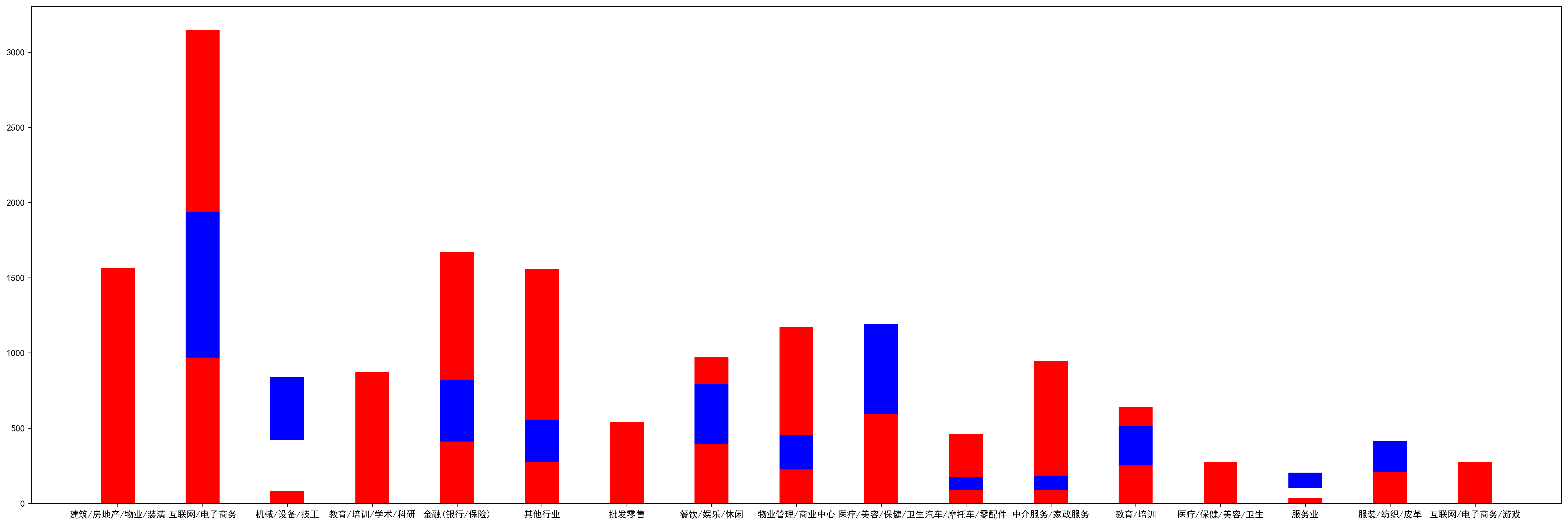 import matplotlib.pyplot as plt from matplotlib import font_manager #解决中文报错 from pylab import * mpl.rcParams['font.sans-serif'] = ['SimHei'] mpl.rcParams['axes.unicode_minus'] = False #对lstx进行处理 plt.figure(figsize=(30,10),dpi = 250) plt.bar(lstxx,lsty1,width=0.4,label="不限",fc='r') plt.bar(lstxx,lsty2,bottom=lsty2,width=0.4,label="有经验",fc="b") plt.show()