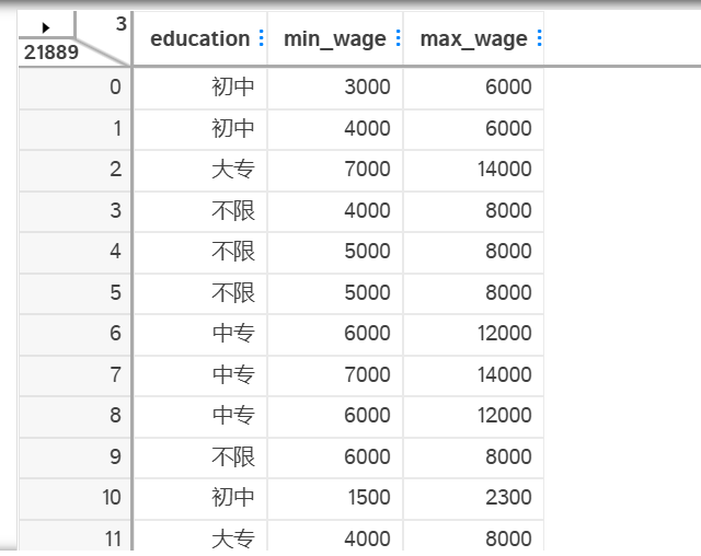 将数据中的教育,最低工资,最高工资进行清洗,并存储在edu.csv文件中