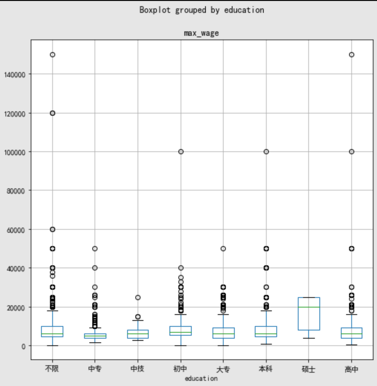 import seaborn as sns #最低工资和学历的关系 edu_data.boxplot(column="min_wage", by="education",figsize=(8,8)) #最高工资和学历的关系 edu_data.boxplot(column="max_wage", by="education",figsize=(8,8))