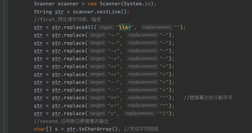 将字符串大量空白字符去除后,紧接着的是对于紧贴着的两个或三个加减号的合并处理。两个及三个紧连加减号的含义代表的实际上是对应于因此或者项亦或者是表达式的正负问题,因此在此的合并含义无需过多赘述。主要需要讨论的是这里要注意到替换紧连的加减号时,如何做到全面覆盖,这里本人图方便直接采取了8次替换的方法,实际上这是存在多余操作的,如何更少的步骤实现细节则需要进一步探讨。