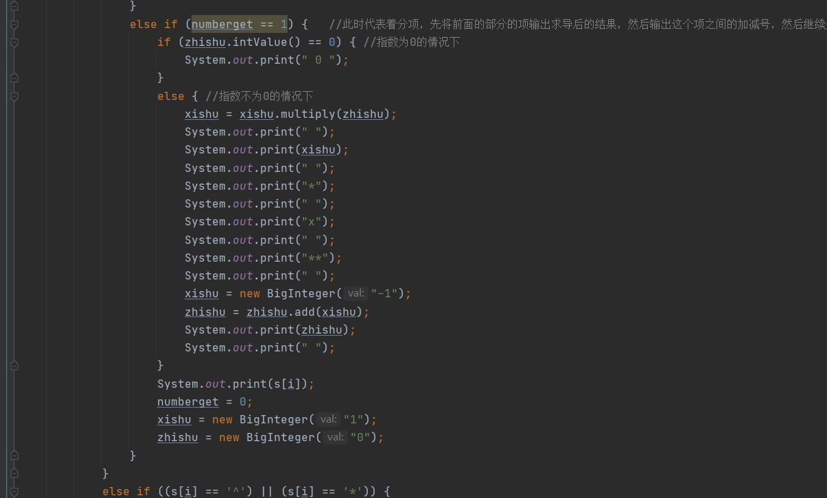 最后的步骤,也是本次表达式预处理的点睛之笔,为本人在代码设计上带来较大便利的替换。第一步是将“**"替换成“^”,幂次符号的简化,很容易想到。第二步则是将“x^”处理成“^”,这一步的关键思想所在是,将x这个稍显多余的项从表达式中去除掉。而原本x的作用怎么去除替换后才不出现问题呢?这还需要配合到第三步,将“x”转化成“^1”。来分析一下这么做的道理。首先是我们要清楚x的作用是什么。x的作用有两个,一个是用来标志,在其后的数字因子代表的是一个幂次数,另一个则是如果其后不存在数字因子时,代表的其本身带有一个1次幂的幂次数。那么就很好解释这第二步和第三步的采用理由了,首先是将其后带幂数字因子的x去除掉,随后再将不带数字因子的x替换成一个1次幂的幂次数,尤其要注意的是,这两步一定不要调换步骤,否则x的指代性作用会出现问题,这将导致识别出错。问题是,这么操作之后,幂次数怎么找出来呢?很简单,看“^”的指示就行了,这里的第三步也正是为了完成这一步。