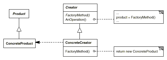 Product是公共父类或者接口,ConcreteProduct为其子类。ConcreteCreator为创建类的工厂,提供了实例化对象的方法FactoryMethod(),其它对象在需要实例化的Product的时候,就不用自己创建,而是调用工厂中的FactoryMethod()方法来实例化。
