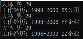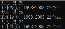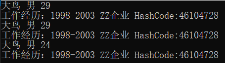 public void Display() { Console.WriteLine("{0} {1} {2} ", name, sex, age); Console.WriteLine("工作经历:{0} {1} HashCode:{2}", work.WorkDate, work.Company, work.GetHashCode()); }