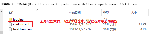 4.2进入maven的conf目录看可以找到maven的settings.xml文件,用来进行全局配置文件,配置本地仓库、远程仓库等全局设置