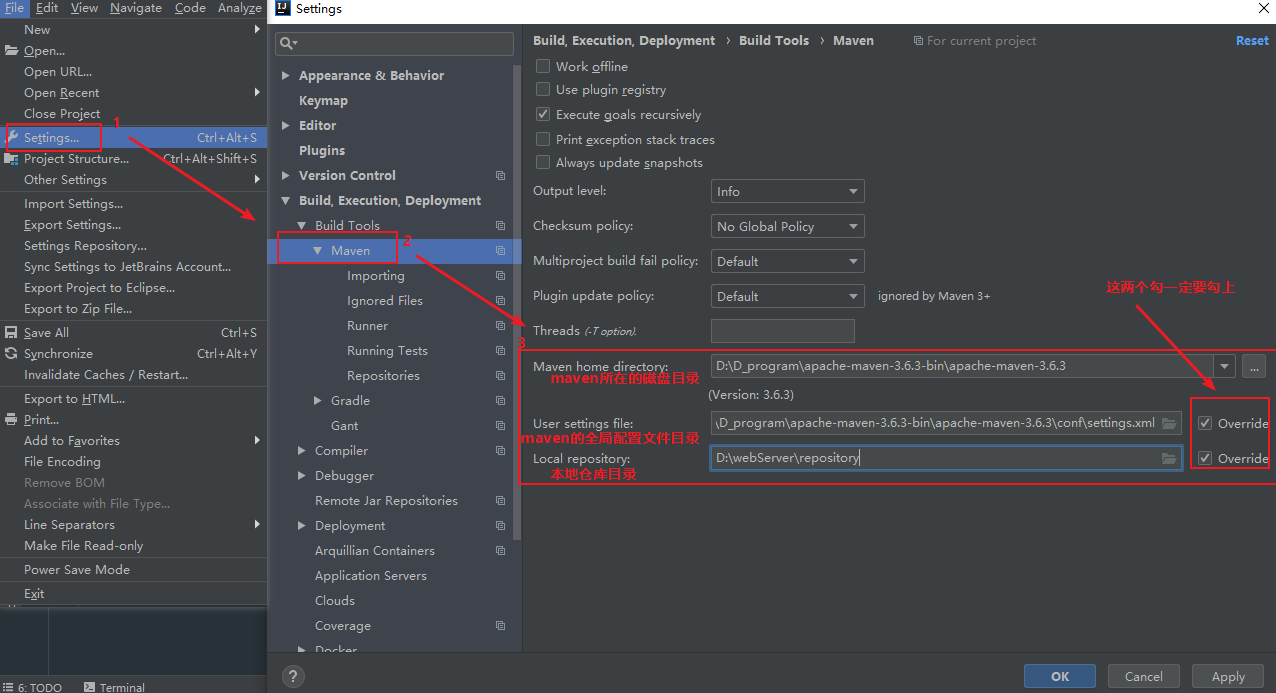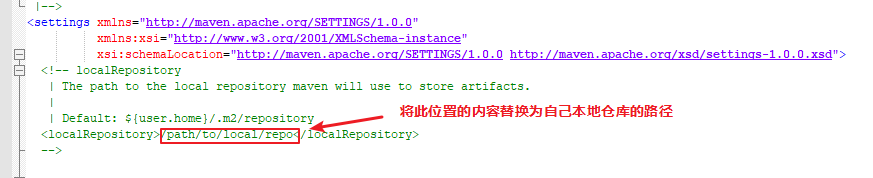 - 3号方框内的内容不可以使用默认,一定要对里面的信息根据自己的实际情况修改为自己本地的maven服务器位置与配置文件文件
