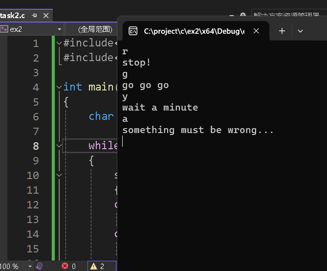 1 #include<stdio.h> 2 #include<stdlib.h> 3 4 int main() 5 { 6 char color; 7 8 while(scanf_s("%c",&color)!=EOF) 9 { 10 switch(color) 11 { 12 case'r':printf("stop!\n"); 13 break; 14 case'g':printf("go go go\n"); 15 break; 16 case'y':printf("wait a minute\n"); 17 break; 18 default:printf("something must be wrong...\n"); 19 break; 20 } 21 getchar(); 22 } 23 24 system("pause"); 25 return 0; 26 }