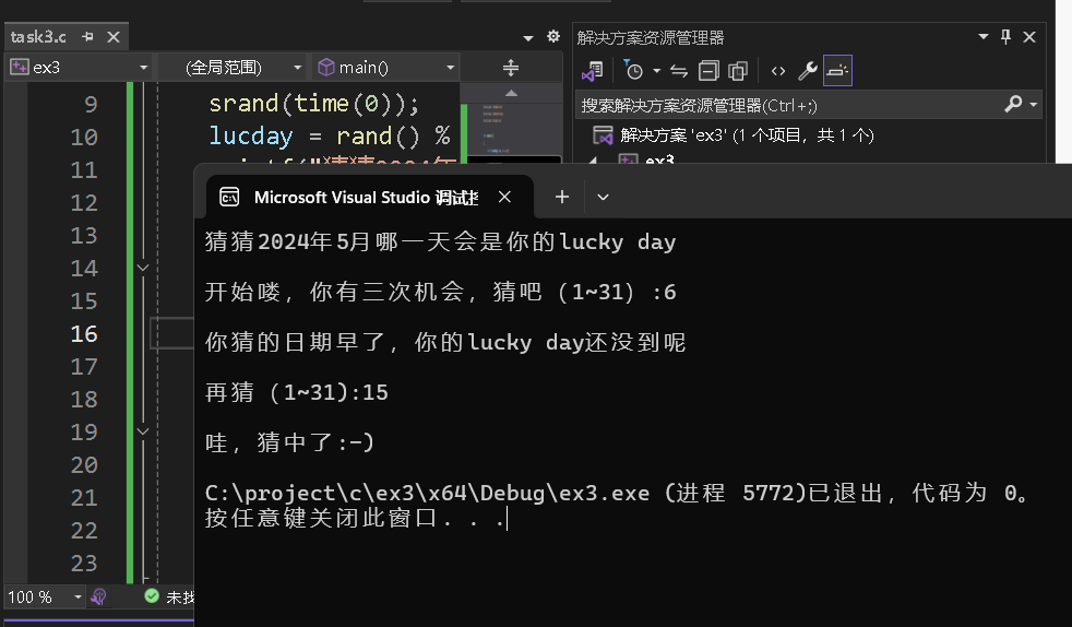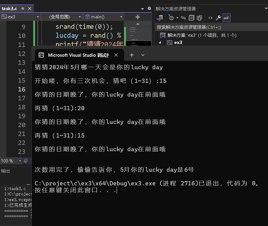 1 #include <stdio.h> 2 #include <stdlib.h> 3 #include <time.h> 4 5 int main() 6 { 7 int lucday, a, b = 0; 8 9 srand(time(0)); 10 lucday = rand() % 31 + 1; 11 printf("猜猜2024年5月哪一天会是你的lucky day\n\n"); 12 printf("开始喽,你有三次机会,猜吧(1~31):"); 13 14 while (b < 3) 15 { 16 scanf_s("%d", &a); 17 printf("\n"); 18 19 if (a == lucday) 20 { 21 printf("哇,猜中了:-)\n"); 22 return 0; 23 } 24 else if (a < lucday) 25 { 26 printf("你猜的日期早了,你的lucky day还没到呢\n"); 27 } 28 else 29 { 30 printf("你猜的日期晚了,你的lucky day在前面哦\n"); 31 } 32 33 if (b < 2) 34 { 35 printf("\n再猜(1~31):"); 36 } 37 38 b++; 39 } 40 41 if (b == 3) 42 { 43 printf("\n\n次数用完了,偷偷告诉你,5月你的lucky day是%d号\n", lucday); 44 } 45 46 return 0; 47 }