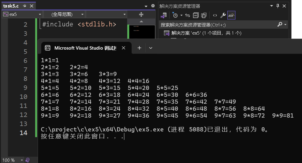 int main() { int a = 0; for (a = 1;a <= 9;a++) { int b = 0; for (b = 1;b <= i;b++) printf("%d*%d=%2d\t ", a, b, a * b); printf("\n"); } return 0; }