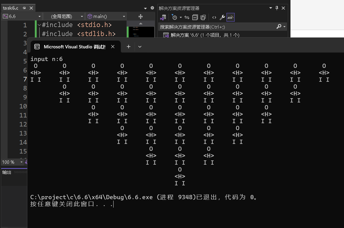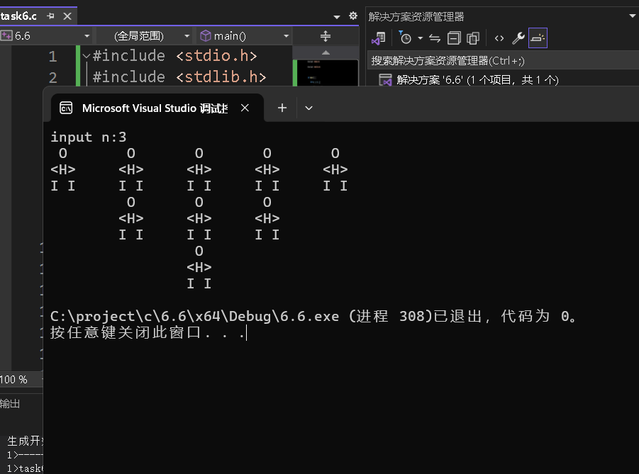 1 #include <stdio.h> 2 #include <stdlib.h> 3 4 int main() { 5 int n, i, k, j; 6 printf("input n:"); 7 scanf_s("%d", &n); 8 9 for (i = 0; i < n; i++) 10 { 11 for (j = 0; j < i; j++) 12 { 13 printf("\t"); 14 } 15 for (k = 2 * (n - i) - 1; k > 0; k--) 16 { 17 printf(" O \t"); 18 } 19 printf("\n"); 20 21 for (j = 0; j < i; j++) 22 { 23 printf("\t"); 24 } 25 for (k = 2 * (n - i) - 1; k > 0; k--) { 26 printf("<H>\t"); 27 } 28 printf("\n"); 29 30 for (j = 0; j < i; j++) 31 { 32 printf("\t"); 33 } 34 for (k = 2 * (n - i) - 1; k > 0; k--) 35 { 36 printf("I I\t"); 37 } 38 printf("\n"); 39 } 40 return 0; 41 }