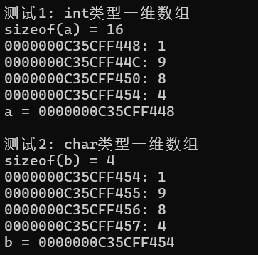 1 #include <stdio.h> 2 #define N 4 3 4 void test1() { 5 int a[N] = {1, 9, 8, 4}; 6 int i; 7 8 // 输出数组a占用的内存字节数 9 printf("sizeof(a) = %d\n", sizeof(a)); 10 11 // 输出int类型数组a中每个元素的地址、值 12 for (i = 0; i < N; ++i) 13 printf("%p: %d\n", &a[i], a[i]); 14 15 // 输出数组名a对应的值 16 printf("a = %p\n", a); 17 } 18 19 void test2() { 20 char b[N] = {'1', '9', '8', '4'}; 21 int i; 22 23 // 输出数组b占用的内存字节数 24 printf("sizeof(b) = %d\n", sizeof(b)); 25 26 // 输出char类型数组b中每个元素的地址、值 27 for (i = 0; i < N; ++i) 28 printf("%p: %c\n", &b[i], b[i]); 29 30 // 输出数组名b对应的值 31 printf("b = %p\n", b); 32 } 33 34 int main() { 35 printf("测试1: int类型一维数组\n"); 36 test1(); 37 38 printf("\n测试2: char类型一维数组\n"); 39 test2(); 40 41 return 0; 42 }