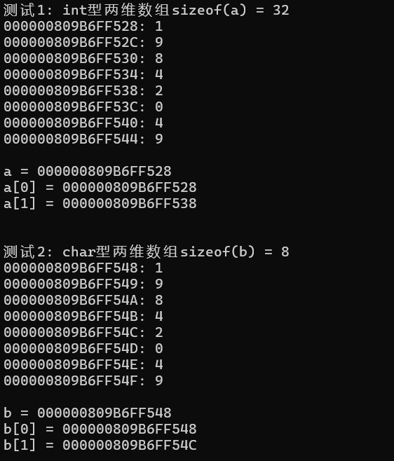 2.int型二维数组b在内存中是"按行连续存放"的,每个元素占用1个内存字节单元,数组名b的值,b[0]的值、&b[0][0]的值在数字字面值上是一样的。