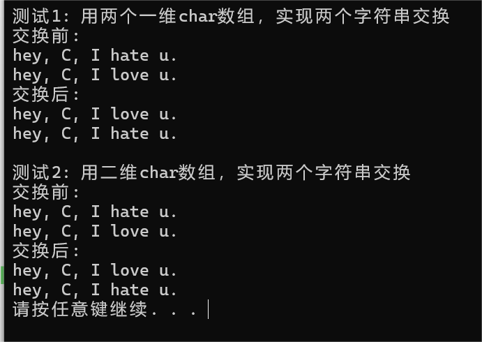#include <stdio.h> #include <string.h> #define N 80 void swap_str(char s1[], char s2[]); void test1(); void test2(); int main() { printf("测试1: 用两个一维char数组,实现两个字符串交换\n"); test1(); printf("\n测试2: 用二维char数组,实现两个字符串交换\n"); test2(); return 0; } void test1() { char views1[N] = "hey, C, I hate u."; char views2[N] = "hey, C, I love u."; printf("交换前: \n"); puts(views1); puts(views2); swap_str(views1, views2); printf("交换后: \n"); puts(views1); puts(views2); } void test2() { char views[2][N] = {"hey, C, I hate u.", "hey, C, I love u."}; printf("交换前: \n"); puts(views[0]); puts(views[1]); swap_str(views[0], views[1]); printf("交换后: \n"); puts(views[0]); puts(views[1]); } void swap_str(char s1[N], char s2[N]) { char tmp[N]; strcpy(tmp, s1); strcpy(s1, s2); strcpy(s2, tmp); }
